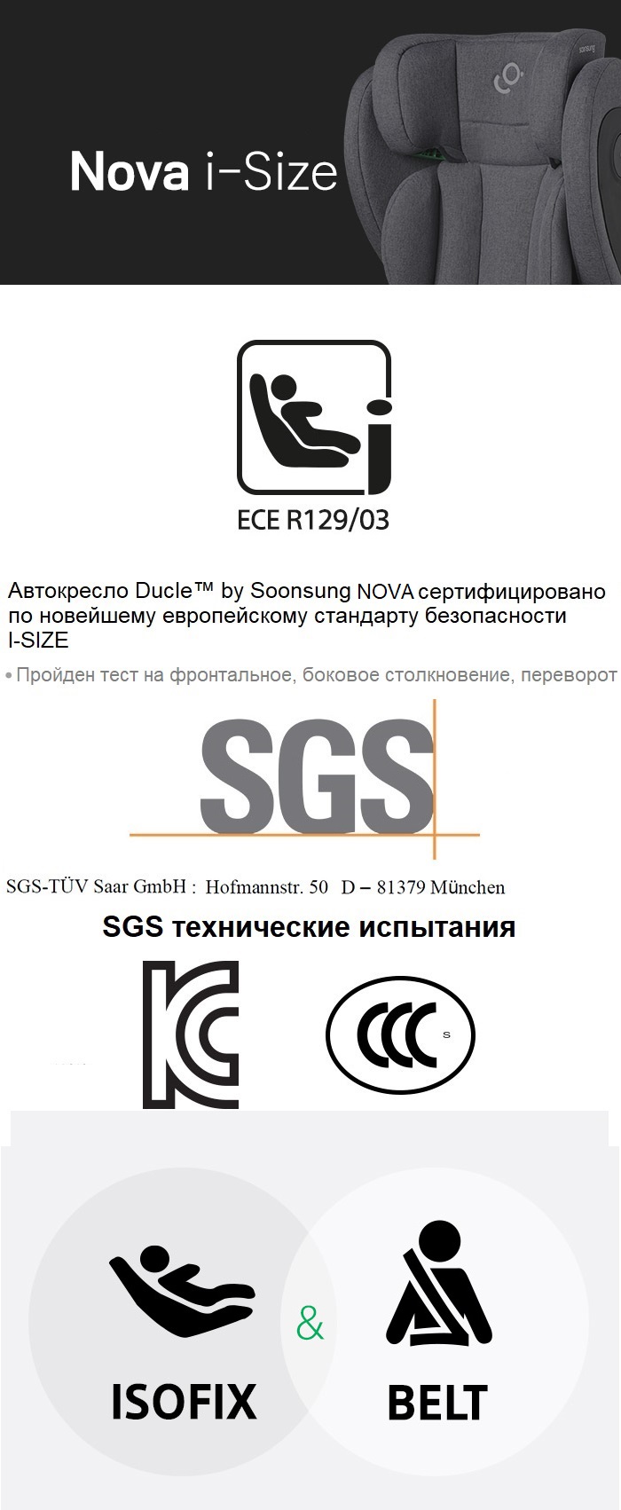 Передовой стандарт безопасности ECE R-129(i-Size), в соответствии с которым разработано и производится Ducle ™ by Soonsung™ NOVA i-Size (Дакл бай Сунсонг Нова айсайз), гарантирует высокий уровень безопасности автокресла, которое тестировалось также и собственными лабораториями корейской компании.