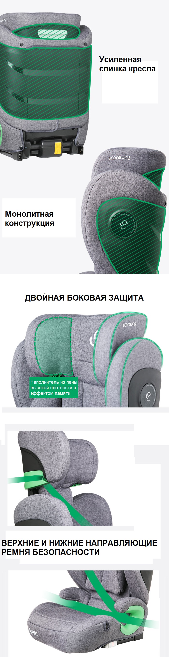 Корпус кресла выполнен из специального ударопрочного пластика, в боковинах предусмотрены энергопоглощающие элементы. Наклон "плавающей" спинки повторяет положение спинки сиденья автомобиля, на котором оно установлено, при необходимости спинка легко отсоединяется и кресло превращается в бустер.