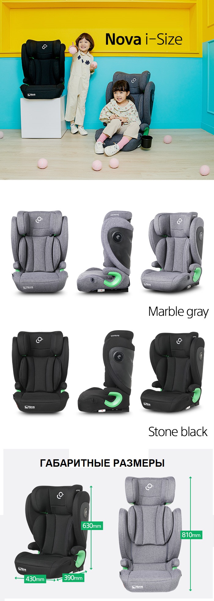Детское автокресло Ducle ™ by Soonsung™ NOVA i-Size (Дакл бай Сунсонг Нова айсайз) предназначено для детей ростом от 105 до 150 см, что примерно соответствует возрасту от 3-х до 12-ти лет. Ребенок в кресле удерживается с помощью штатного ремня безопасности, для большего удобства при установке сиденье оборудовано креплениями isofix с индикаторами правильной установки, однако при отсутсвтии скоб изофикс в автомобиле детское кресло можно использовать и без него.