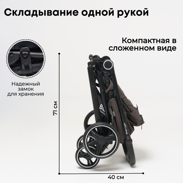Несмотря на внушительные габариты, прогулочная коляска BubaGO BASS LIGHT легко и компактно складывается тканью внутрь одной рукой по принципу «книжка», для удобства хранения и переноски имеет транспортировочный замок.