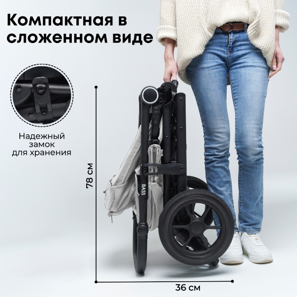 Несмотря на внушительные габариты, прогулочная коляска BubaGO BASS легко и компактно складывается одной рукой текстилем внутрь по принципу «книжка», для удобства хранения и переноски имеет транспортировочный замок.