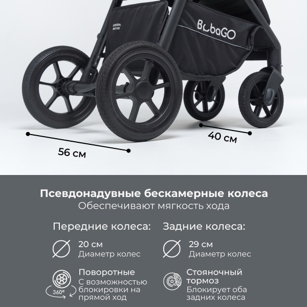 Прежде всего, что делает BASS коляской, способной проходить в тех местах, которые будут объезжать все остальные? Это, конечно же, колеса! Во-первых, псевдонадувные колеса из бескамерной резины, не боятся проколов и обеспечивают максимально мягкий ход, а во-вторых – только посмотрите на их размер: диаметр передних – 20 см, а задних – 29 см. Такие колеса легко проедут по любому бездорожью, грязи и глубокому снегу.