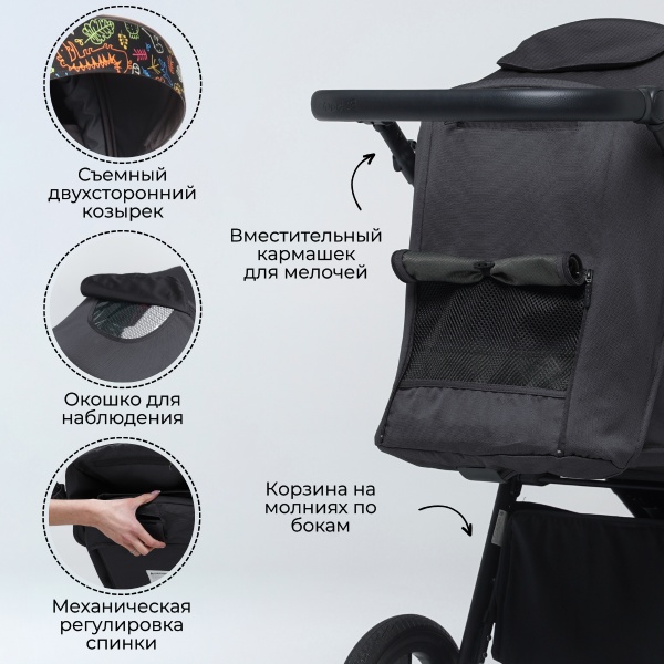 С этой проходимой и легко управляемой коляской, оснащенной комфортным сиденьем и регулируемой спинкой, включая полноценное горизонтальное положение, каждая прогулка с малышом станет приятным и комфортным времяпрепровождением.