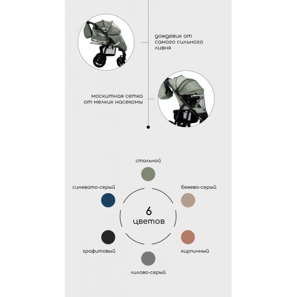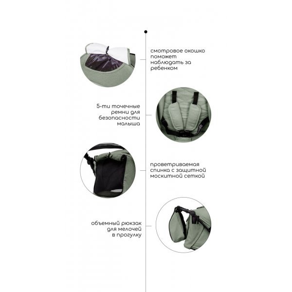 Регулируемая родительская ручка с накладкой из эко кожи помогает подстроить коляску под любой рост. Задняя стенка коляски полностью открывается для проветривания, а встроенная в нее москитная сетка помогает циркулировать воздуху.