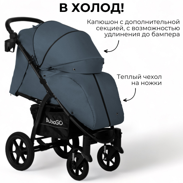 У Bubago CROSS AIR большие гелевые, обеспечивающие мягкий и плавный ход колеса, большой регулируемый капюшон, просторное спальное место и хорошая амортизация на каждом колесе сделают прогулки с ней максимально комфортными в любое время года и по любой местности.
