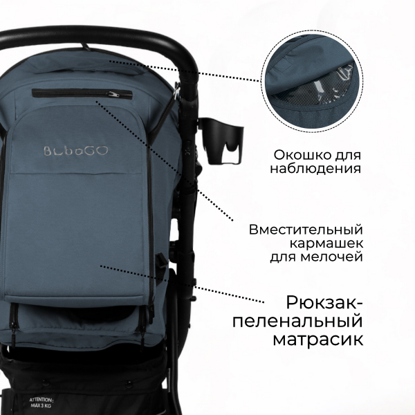 Bubago CROSS AIR имеет механическую спинку, просторное сидение, может легко превращаться в спальное место вплоть до горизонтального. Регулируемую подножку с эко кожей на уровне обуви малыша, что позволяет не вымазывать подножку после прогулки, а также не создаст дискомфорт для ножек малыша в теплую и прохладную погоду (парниковый эффект будет отсутствовать). В подножке хранится москитная сетка, которую легко можно достать, а так же легко упаковать обратно.