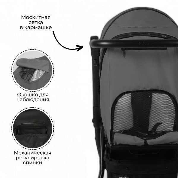 Задняя стенка коляски полностью открывается для проветривания, а встроенная в нее москитная сетка помогает циркулировать воздуху. Также на задней спинке есть удобный кармашек для мелочей.