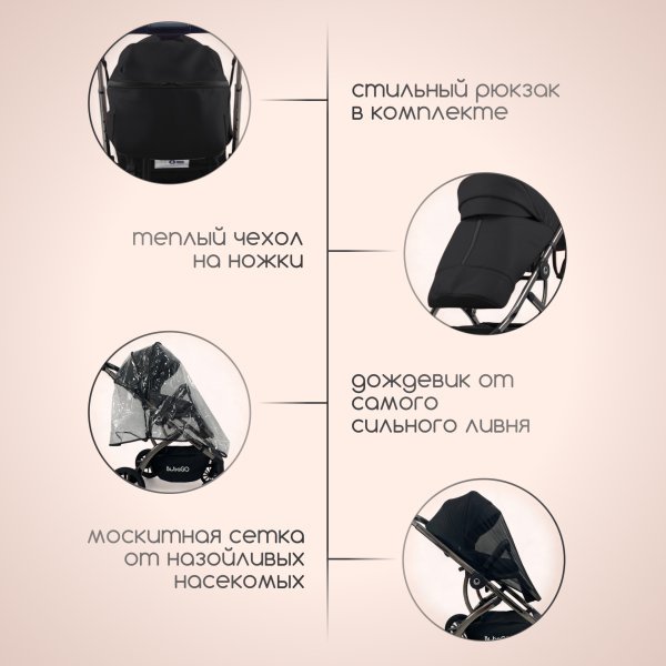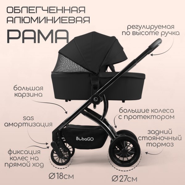 Коляска комплектуется автолюлькой BubaGO, у которой есть переходники для установки на шасси коляски, таким образом вы сможете использовать ее как автолюльку и как дополнительный блок коляски. Очень удобно использовать автолюльку с шасси: благодаря конструкции люльки вы можете перевозить малыша в авто и в коляске, не доставая из автолюльки, просто перемещая ее саму и используя как переноску.