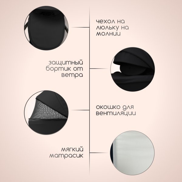 Глубокий капюшон с секцией на молнии и дополнительным съемным козырьком, как на прогулочном блоке, так и на люльке, для защиты ребенка от погодных условий и солнечных лучей делает прогулки комфортными в любое время года. От жары спасет секция для вентиляции в капоре. Москитная сетка защитит от назойливых насекомых, а дождевик от любой непогоды. Накидка на люльке легко расстегивается для быстрого доступа к малышу зимой, а также имеет дополнительный клапан со смотровым окошком, который полностью закрывает отверстие в люльке при сильной непогоде или морозе. Матрасик и стенки люльки внутри покрыты х/б тканью, которая снимается для стирки при необходимости. Ручка для переноски и ножки на дне люльки делают ее транспортировку удобной и безопасной.