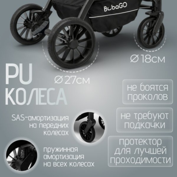 Бескамерные резиновые колёса с глубокими протекторами и пружинной амортизацией на всех колёсах гарантируют плавный ход по разным типам дорог — от городских тротуаров до неровных покрытий.