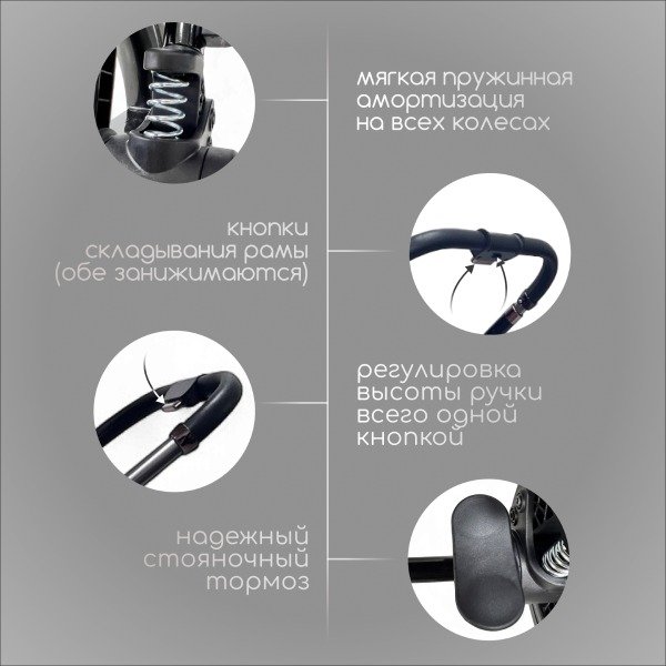 Коляска создана для жизни в городе и за его пределами: большие полиуретановые колёса с протектором, великолепная пружинная амортизация и надёжная рама из высокопрочного авиационного алюминия обеспечивают плавный ход даже по неровным дорогам, а лёгкая система складывания делает её удобной в транспортировке и хранении.