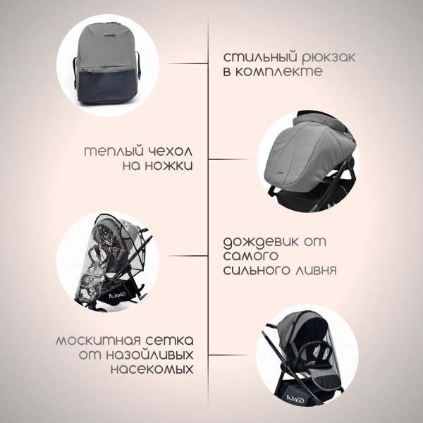 - Максимальная комплектация: теплые чехлы на ножки, москитная сетка и дождевик, стильный рюкзак для мамы с кожаными вставками.