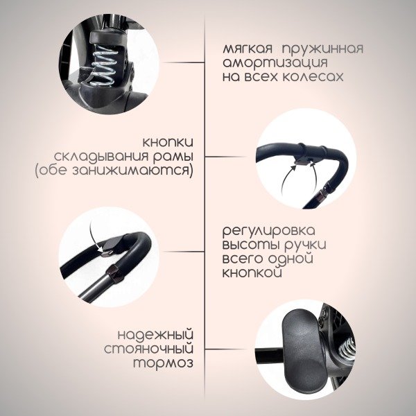 Коляска создана для жизни в городе и за его пределами: большие полиуретановые колёса с протектором, великолепная пружинная амортизация и надёжная рама из высокопрочного авиационного алюминия обеспечивают плавный ход даже по неровным дорогам, а лёгкая система складывания делает её удобной в транспортировке и хранении.