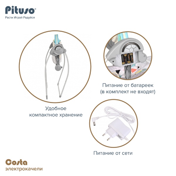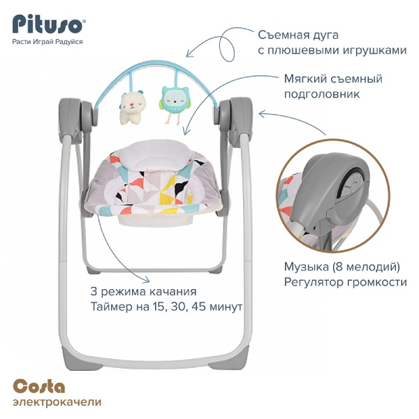Характеристики: Съемная дуга с плюшевыми игрушками Музыка (8 мелодий), регулятор громкости 3 режима качания Таймер на 15,30,45 минут 3-точечные ремни безопасности Мягкий съемный подголовник Питание от с... Читать далее...