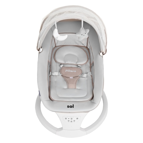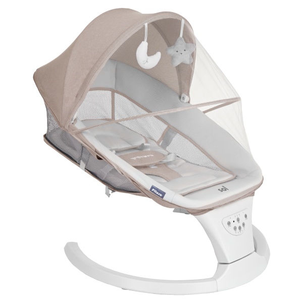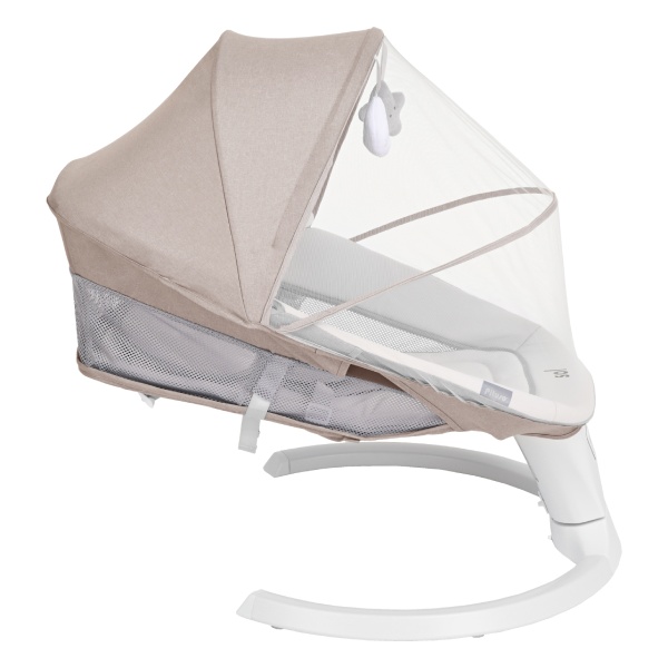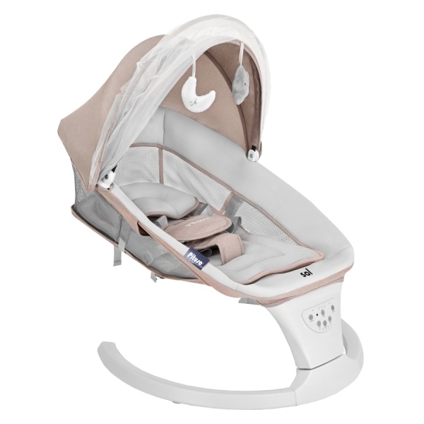 Электрокачели оснащены удобной ремневой регулировкой спинки, что позволяет выбрать наиболее удобное положения ребенка полусидя или полулежа в зависимости от возраста малыша, а также ложе легко раскладывается в горизонтальное положение.