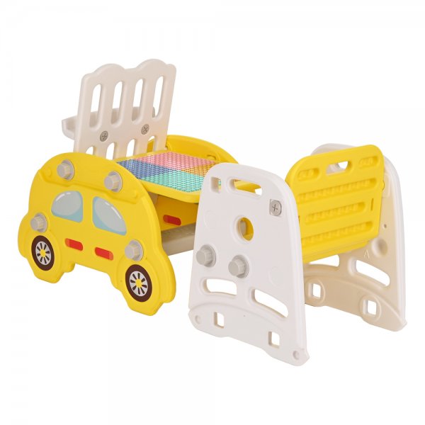 Стол и стульчик - столешница стола двухсторонняя: на одной стороне можно рисовать при помощи маркеров и фломастеров (2 шт. входят в комплект), играть с любыми игрушками, заниматься рисованием и другими играми, другая сторона предназначена для игр с конструктором. Конструктор, в количестве 62 элемента, также входит в комплект.