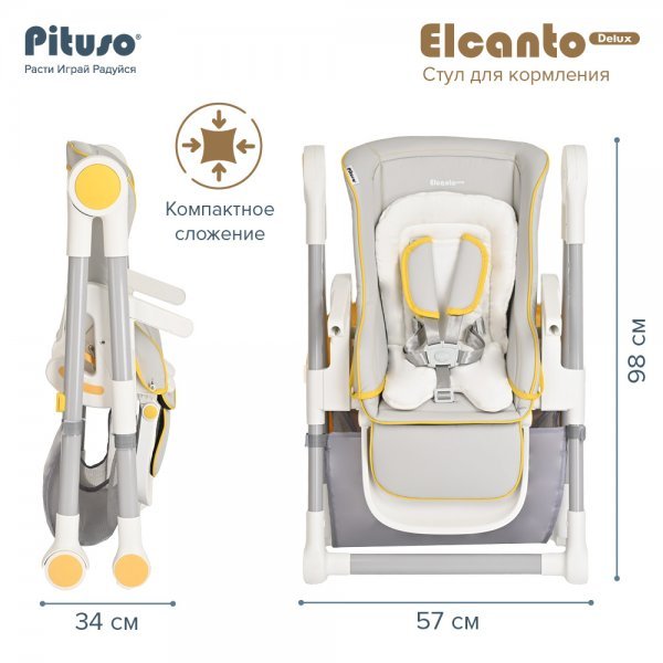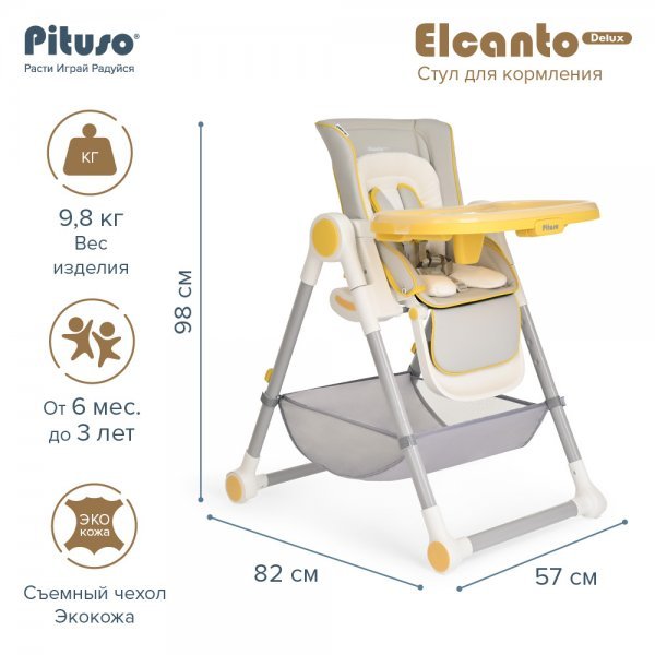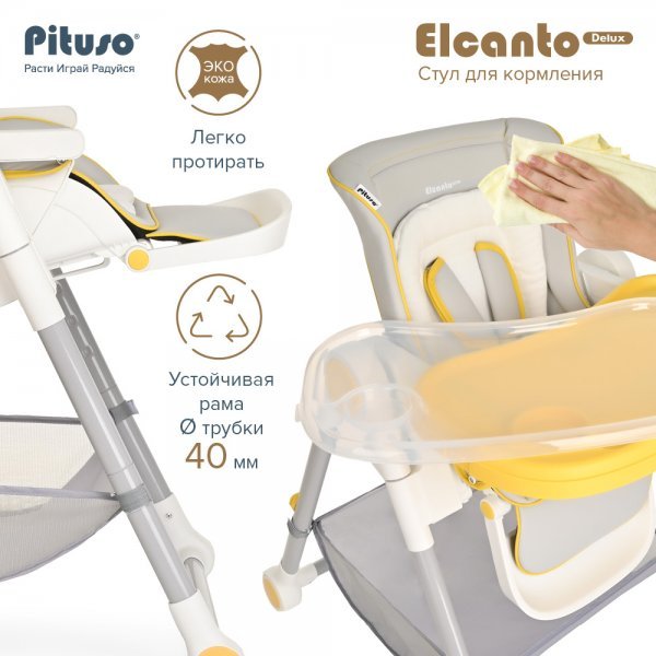 PITUSO ELCANTO DELUX - современный стульчик для кормления детей в возрасте от 6 месяцев до 3 лет. Он регулируется по высоте, имеет подставку для ног и съемный столик, что позволяет расти вместе с ребенком. Чехол стульчика выполнен из экологичной кожи, что облегчает уход за ним и делает его удобным для ребенка. Вкладыш из мягкого материала обеспечивает комфорт для малышей. Алюминиевая рама делает стульчик легким, прочным и устойчивым, а задние колесики обеспечивают его мобильность. Съемные внутренние пятиточечные страховочные ремни обеспечат полную безопасность Вашему малышу. Кроме того, стульчик легко и компактно складывается. Приятного аппетита вашему малышу!
