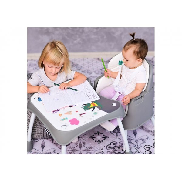 Функция 3в1: стульчик для кормления; сиденье на стуле, которое можно установить на взрослый стул со следующими минимальными габаритами – высота спинки 400 мм, ширина сиденья 430 мм, глубина сиденья 390 мм; маленький стул и отдельный стол. 5-точечный ремень безопасности; съемный поднос для кормления; стол с красочной забавной и познавательной полиграфией. Стульчик для кормлени легко трансформируется в отдельно стульчик и стол, а ножки маленького стула можно легко сложить и спрятать под основание сиденья. Чехол из искусственной кожи для большего комфорта. Складывается до компактных размеров. Функции "стульчик для кормления" и "сиденье на стуле": Подходит для детей от 6 до 36 м. Функция "маленького стула и стола": Подходит для детей старше 36 месяцев.