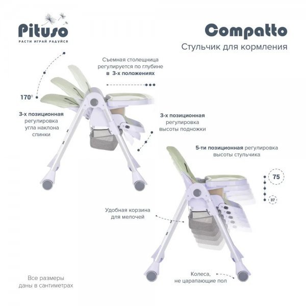 Pituso Compatto – устойчивый и комфортный стульчик для кормления. Стульчик легко складывается и не занимает много места, оснащен 2-мя колесиками, которые позволяют легко передвигать стул по дому, а благодаря съемному чехлу из ЭКО кожи стульчик удобен и прост в уходе. 3 позиции для регулировки столика позволяют настроить наилучшее положение для кормления, а лоток для приема пищи отлично моется в посудомоечной машине. Пятиточечные страховочные ремни безопасности помогут весело проводить время с малышом, не опасаясь, что ребенок может упасть. Угол наклона спинки фиксируется в 3-х положениях (сидя, полулежа и практически лежа 170 градусов максимальный угол наклона спинки). Современная эргономичная форма прекрасно впишется в любой интерьер.