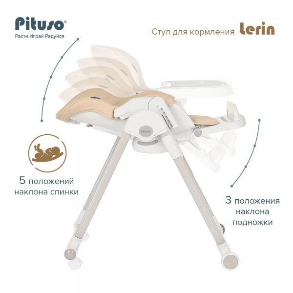 Стульчик Pituso LERIN - функциональный и удобный стульчик для кормления. Алюминиевая рама создает устойчивость и надежность, а задние колесики оснащены педалью тормоза. Безопасная конструкция с мягким сидением легко чистится и компактно складывается. Съемный столик подгоняется в наилучшее положение для кормления, а лоток для приема пищи легко моется. Высоту стульчика Pituso LERIN можно настроить в 6 положениях. Пятиточечные страховочные ремни безопасности позволят весело проводить время с малышом, не опасаясь, что он вывалится наружу. Свободно регулируемый угол наклона спинки и 3-х ступенчатая регулировка подножки позволит ребенку сладко вздремнуть после приема пищи. Современная эргономичная форма прекрасно впишется в любой интерьер.