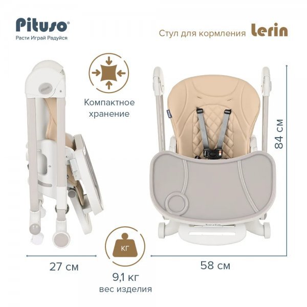 Стульчик Pituso LERIN - функциональный и удобный стульчик для кормления. Алюминиевая рама создает устойчивость и надежность, а задние колесики оснащены педалью тормоза. Безопасная конструкция с мягким сидением легко чист... Читать далее...